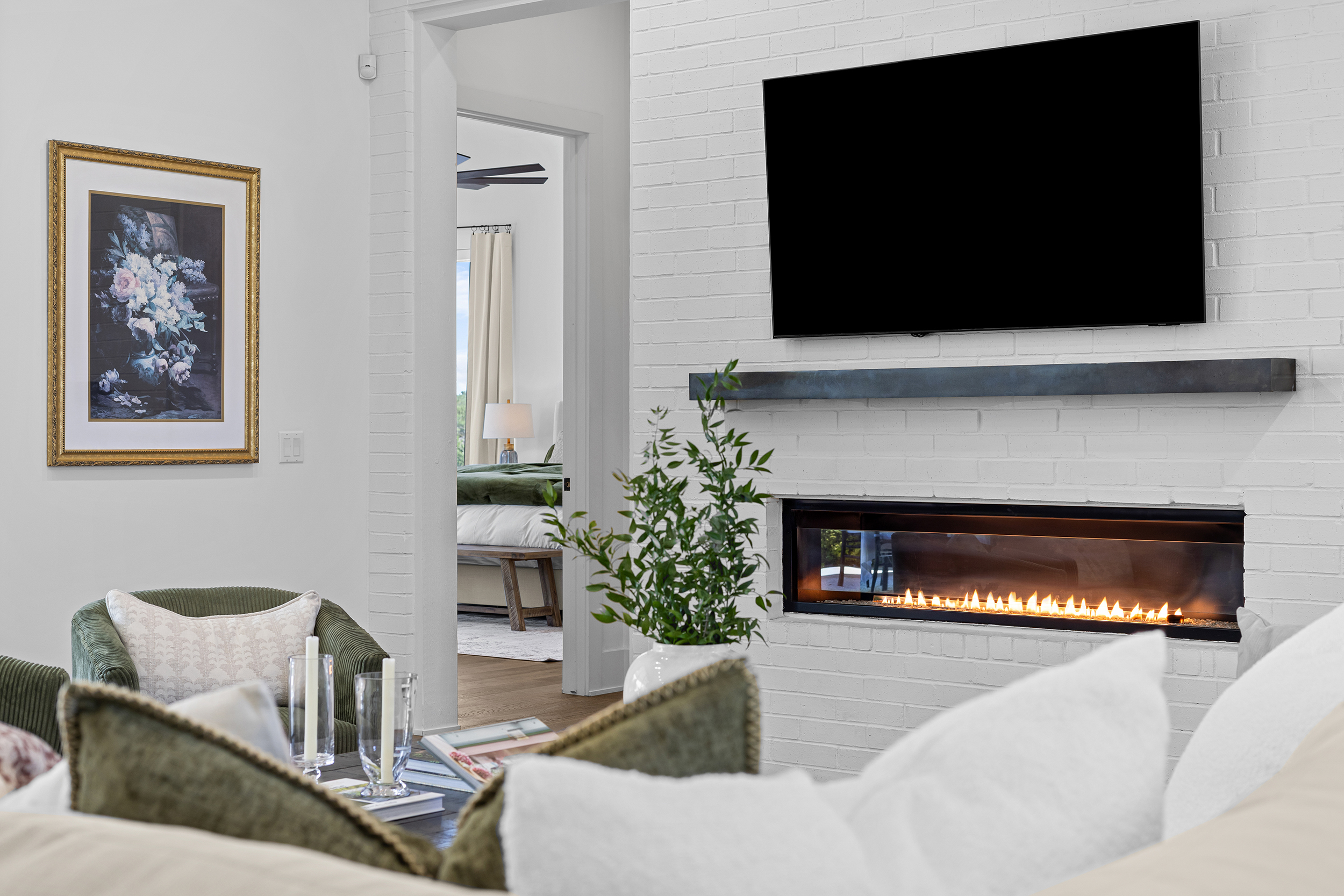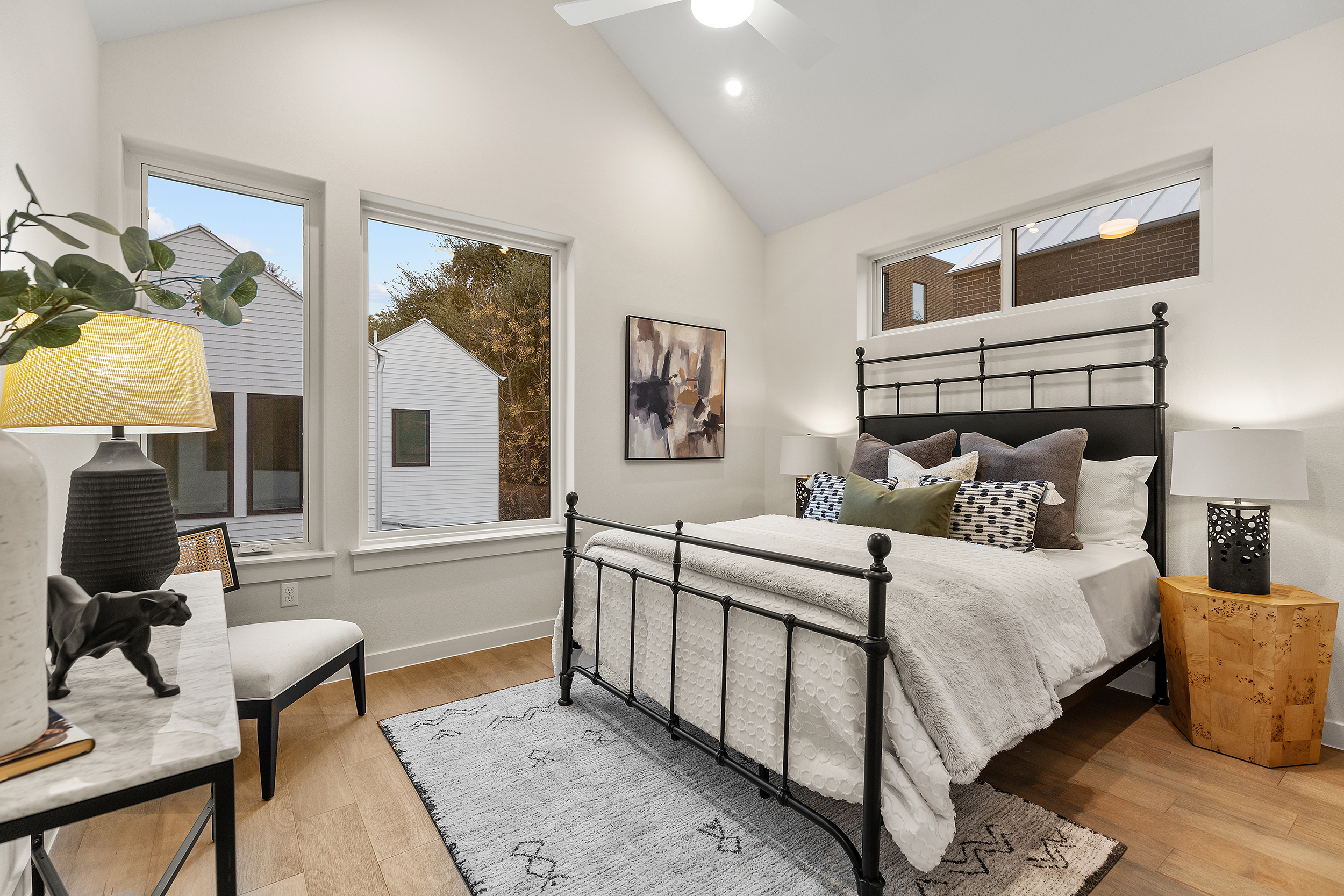 - Clear nightstands (lamp + one décor item only)